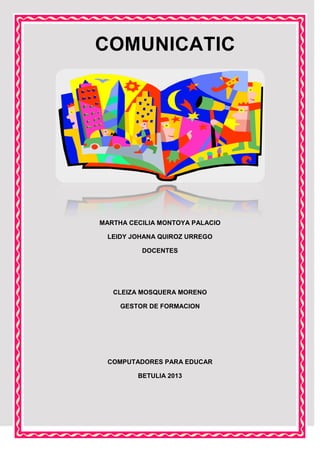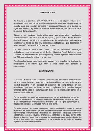 Este documento presenta el proyecto "COMUNICATIC" cuyo objetivo es desarrollar las competencias comunicativas en estudiantes de segundo y tercer grado a través del uso de las tecnologías de la información y la comunicación (TIC). El proyecto se llevará a cabo en el Centro Educativo Rural Guillermo Lema Díaz e implementará actividades pedagógicas utilizando páginas web, portales educativos y herramientas digitales para mejorar la lectura, escritura y habilidades comunicativas de