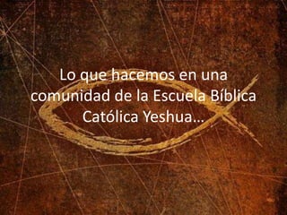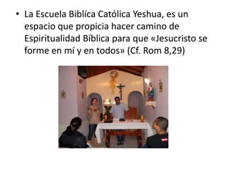Este documento describe las cinco etapas del proceso de formación espiritual en la Escuela Bíblica Católica Yeshua: 1) Encuentro con Jesús, 2) Conversión, 3) Discípulo, 4) Vida en comunidad, 5) Misión. Explica que cada etapa implica un mayor compromiso con Jesucristo y la iglesia, culminando en compartir la fe con otros. Finalmente, define una comunidad cristiana como un grupo de personas llamadas por Dios para aceptar la salvación de Jesús y apoyarse mutuamente en