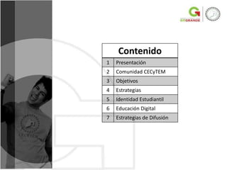 Este documento propone la creación de una organización interna llamada Comunidad CECyTEM para desarrollar estrategias de comunicación que promuevan la identidad de los estudiantes y profesores con el Colegio de Estudios Científicos y Tecnológicos del Estado de México. Las estrategias incluyen el uso de nuevas tecnologías, eventos culturales y deportivos, y canales como radio y TV para difundir el orgullo de pertenecer a la institución.