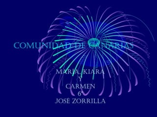 Este documento proporciona información sobre la comunidad autónoma de Canarias en España. Canarias es un archipiélago de 7 islas principales situado en el océano Atlántico frente a las costas de Marruecos y el Sahara. El documento describe aspectos clave de Canarias como su escudo, bandera, carnavales, gastronomía, fauna, flora, clima, montañas, playas y zoológicos.
