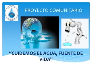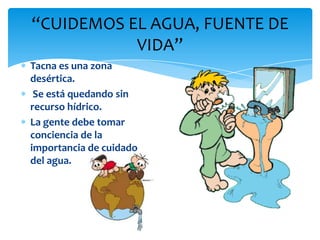 El documento habla sobre un proyecto comunitario para cuidar el agua en Tacna, una zona desértica que se está quedando sin recursos hídricos. La gente debe tomar conciencia de la importancia de cuidar el agua debido a que las reservas se están contaminando y la comunidad a veces tiene que buscar agua, lo que preocupa a las autoridades que buscan formas de abastecer a la ciudad.