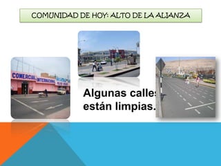 El documento describe brevemente la limpieza de algunas calles y la falta de tachos de basura en la mayoría de las calles en la comunidad de Alto de la Alianza. También incluye los nombres de cinco mujeres de la comunidad.