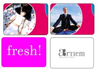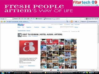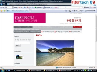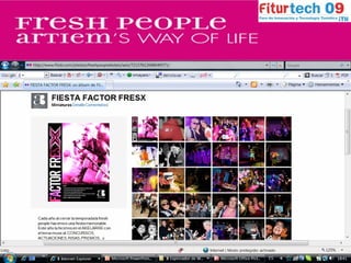 El documento describe los esfuerzos de Artiem Hotels para crear una comunidad en línea llamada "Fresh People" para compartir su filosofía de vida saludable y sostenible. Buscan utilizar las redes sociales para mejorar la experiencia del cliente, fomentar la lealtad a la marca y dar a conocer sus valores. Han lanzado el sitio http://comunidad.artiemhotels.com/ para que los clientes, empleados y otras personas interesadas puedan publicar contenido y experiencias relacionadas con el bienestar, la ecología y las personas.