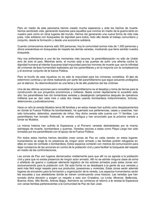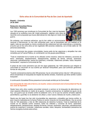 La comunidad de paz de San José de Apartadó, compuesta por más de 1,300 personas, celebra su octavo aniversario buscando alternativas de vida digna en medio de la violencia en Urabá, Colombia, donde han sufrido más de 380 violaciones de derechos humanos y 146 asesinatos. La comunidad, a pesar de las amenazas y agresiones por parte del ejército y paramilitares, sigue esforzándose por establecer zonas de paz y alternativas de vida justas. Recientemente, han enfrentado una masacre que dejó varios miembros destacados asesinados, lo que ha reafirmado su demanda de justicia y respeto por los derechos humanos.