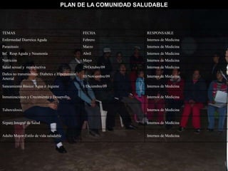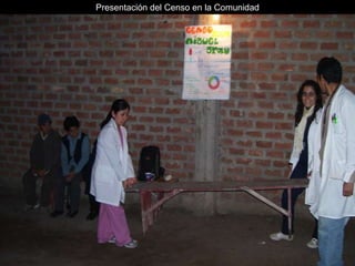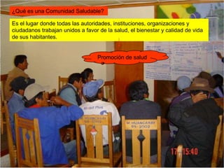 Este documento describe los pasos para implementar una estrategia de comunidades saludables en el Asentamiento Humano Miguel Grau en Chancay, Perú. Se realizó un censo que encontró 165 familias y 322 habitantes. Se llevó a cabo una fase de sensibilización para presentar el concepto de comunidades saludables y recopilar temas de capacitación. La próxima fase involucra la planificación, que incluye mapear la comunidad, diagnosticar necesidades, y desarrollar un plan comunal para lograr una comunidad más sal