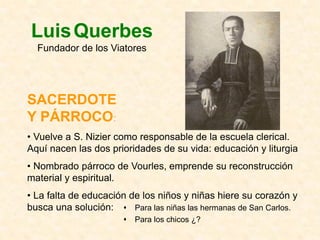El documento resume la historia y misión de la Comunidad Viatoriana. Fue fundada en 1829 por Luis Querbes para proveer educación a niños rurales a través de maestros catequistas laicos. Aunque originalmente incluía laicos, se convirtió solo en una orden de sacerdotes en 1838 cuando fue aprobada por el Papa. Hoy en día, la comunidad incluye religiosos, asociados laicos célibes y casados, diáconos y sacerdotes comprometidos a anunciar el evangelio, especialmente a los jóvenes