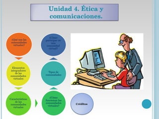El documento describe las características de las comunidades virtuales. Explica que son grupos de personas que comparten intereses u objetivos aunque no compartan un territorio físico, sino que interactúan a través de Internet. Para ser consideradas comunidades, deben tener sentido de pertenencia entre sus miembros, comunicación e influencia mutua, y una cultura compartida.