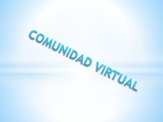 Las comunidades virtuales se forman a partir de intereses compartidos y permiten la interacción entre personas de diferentes lugares a través de plataformas como redes sociales. Aunque facilitan la comunicación y el intercambio de información, también presentan riesgos como el robo de identidad y el acoso virtual. En resumen, las comunidades virtuales son herramientas útiles, pero es importante ser consciente de sus desventajas.