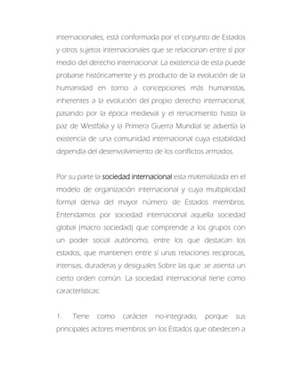 La comunidad internacional se refiere a la unión espontánea de todos los sujetos internacionales como estados y organizaciones que mantienen relaciones entre sí a través del derecho internacional. La sociedad internacional se compone de estos mismos sujetos pero dentro de organizaciones formales creadas mediante tratados, las cuales pueden ser universales, regionales o subregionales. Mientras la comunidad internacional tiene un origen antiguo y espontáneo, la sociedad internacional es más moderna y orgánica.