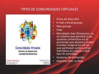 Este documento define las comunidades virtuales como grupos de personas con intereses similares que se comunican a través de Internet y comparten información. Describe varios tipos de comunidades virtuales como foros de discusión, correo electrónico, chats y mundos virtuales. También explica que las comunidades virtuales permiten la construcción de conocimiento colaborativo, la generación de un lenguaje común y la promoción de la interacción entre sus miembros.
