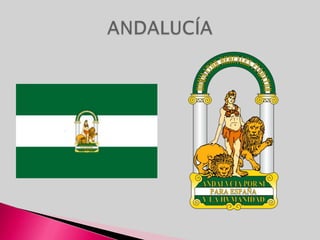 Andalucía se localiza en el sur de España. Tuvo diversos pobladores a lo largo de la historia como los tartesos, romanos, musulmanes y actualmente es una de las 17 comunidades autónomas españolas. Su economía se basa principalmente en el turismo, la agricultura y la pesca. Alberga una gran riqueza natural protegida en parques como Doñana.