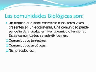 Las comunidades biológicas incluyen seres vivos que habitan en un ecosistema y se subdividen en comunidades terrestres, acuáticas y nichos ecológicos. Las comunidades terrestres incluyen desiertos, bosques y agroecosistemas, cada uno con especies adaptadas a sus condiciones. Las comunidades acuáticas se encuentran en hábitats de agua dulce y salada. El nicho ecológico describe la posición de una especie en relación con factores bióticos, abió