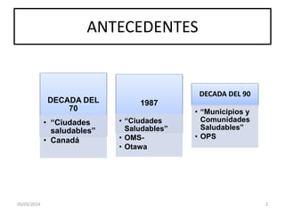 El documento describe la historia y conceptos clave de las comunidades y municipios saludables. Explica que una comunidad saludable es un lugar donde todas las autoridades e instituciones trabajan juntas para mejorar la salud y calidad de vida de los habitantes. También describe las características, líneas de acción e implementación de la estrategia de comunidades saludables a través de fases de organización, planificación, ejecución y evaluación.