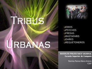 Este documento presenta resúmenes breves de varias tribus urbanas contemporáneas, incluyendo sus orígenes, características distintivas y estilos de vestir. Describe tribus como los emos, fresos, rastafaris, darks, reguetoneros y psychotrónicos.
