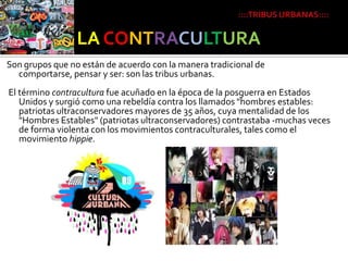::::TRIBUS URBANAS::::LACONTRACULTURASon gruposque no están de acuerdo con la manera tradicional de comportarse, pensar y ser: son las tribus urbanas. El término contracultura fue acuñado en la época de la posguerra en Estados Unidos y surgió como una rebeldía contra los llamados "hombres estables: patriotas ultraconservadores mayores de 35 años, cuya mentalidad de los "Hombres Estables" (patriotas ultraconservadores) contrastaba -muchas veces de forma violenta con los movimientos contraculturales, tales como el movimiento hippie.