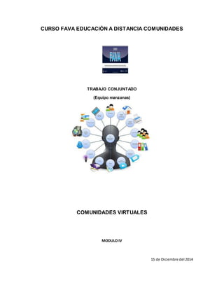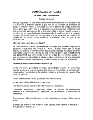 Este documento describe las comunidades virtuales de aprendizaje y sus elementos constitutivos. Explica que el trabajo conjunto es fundamental en la educación a distancia ya que permite acercar a personas de diferentes lugares. Detalla los componentes clave de una comunidad de aprendizaje virtual como planes institucionales, redes de innovación, y sentimiento de pertenencia. Además, explica que los procesos de aprendizaje en estas comunidades incluyen la interacción entre pares, el intercambio de roles, y el potencial de aprendizaje colaborativo