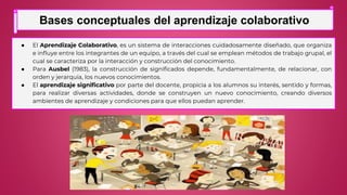 El documento describe los conceptos de aprendizaje colaborativo y comunidades virtuales de aprendizaje. Explica que el aprendizaje colaborativo implica la interacción y construcción colectiva del conocimiento a través de métodos de trabajo en grupo. Las comunidades virtuales permiten la interacción más allá de las barreras espaciales y temporales para compartir contenidos educativos. El documento también analiza los roles del profesor y alumnos, así como las ventajas e inconvenientes del aprendizaje colaborativo mediado por tecnologías