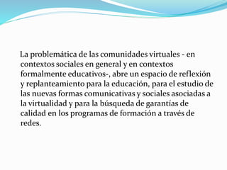 El documento habla sobre las comunidades virtuales en contextos educativos. Explica que una comunidad virtual es un conjunto de personas que interactúan en un espacio virtual compartiendo intereses. Detalla algunas características como la historia compartida y las relaciones a largo plazo. También describe cómo crear una comunidad virtual exitosa, requiriendo equipos multidisciplinarios, objetivos claros, y herramientas tecnológicas que permitan la interacción como chats y correo electrónico.
