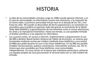 La comunidad virtual surgió en la década de 1970 pero no se desarrolló exponencialmente hasta los años 1990 con el surgimiento de Internet y la World Wide Web. Antes de Internet, las personas usaban sistemas de tablón de anuncios para comunicarse a través de líneas telefónicas. Los objetivos principales de una comunidad virtual son intercambiar información, ofrecer apoyo a través de conversaciones informales, y debatir temas moderados.