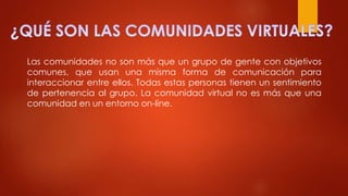 Una comunidad virtual es un grupo de personas con objetivos comunes que se comunican en línea. Al igual que las comunidades tradicionales, las comunidades virtuales tienen jerarquías, normas, protocolos de comunicación y diferentes niveles de participación. Las comunidades virtuales pueden ser una herramienta educativa valiosa al fomentar la colaboración y el aprendizaje autónomo entre los miembros.