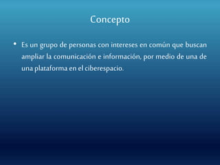 Las comunidades virtuales son grupos de personas con intereses comunes que facilitan la comunicación e intercambio de información a través de plataformas en el ciberespacio. Estas comunidades permiten tanto la interacción sincrónica como asincrónica y pueden abordar diversas necesidades emocionales y sociales. La importancia de estas comunidades radica en su capacidad para ofrecer un sentido de pertenencia y adaptarse a los cambios tecnológicos actuales.