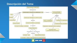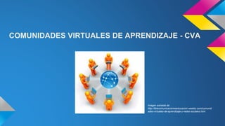 El documento habla sobre las comunidades virtuales de aprendizaje (CVA), definiéndolas como entornos digitales colaborativos para el aprendizaje que trascienden fronteras. Explica que las CVA tienen características como la participación activa, orientación en la planificación y colaboración entre sus miembros. También analiza factores de éxito como la innovación tecnológica, y ventajas como la optimización de costos y acceso universal. Finalmente, concluye que el uso de las CVA en educación se