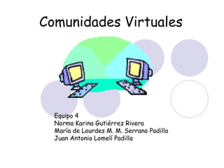 Este documento define una comunidad virtual como un grupo de personas con un interés común en el aprendizaje que comparten experiencias y conocimientos sin límites geográficos. Existen cuatro tipos principales de comunidades virtuales: de discurso, de práctica, de construcción de conocimiento y de aprendizaje. Una comunidad de aprendizaje exitosa requiere accesibilidad, cultura de participación, habilidades compartidas, contenido relevante y un asesor que facilite el aprendizaje colaborativo entre los miembros.