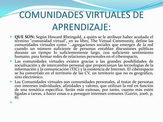 El documento describe las comunidades virtuales de aprendizaje, definidas como agregaciones sociales que emergen en internet cuando personas entablan discusiones públicas sobre un tema durante tiempo suficiente para formar redes de relaciones. Explica sus características, como ser espacios horizontales donde se construye conocimiento de forma colaborativa. También clasifica las comunidades virtuales según sus objetivos, orientación y la naturaleza de las interacciones entre sus miembros.