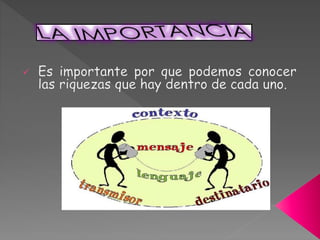El documento resume la historia y los tipos de comunicación. Explica que desde la prehistoria, los humanos han buscado formas de comunicarse para sobrevivir y entenderse unos a otros. A lo largo de la historia se han desarrollado diferentes medios de comunicación como la escritura, la oralidad y la audiovisual. Cada forma de comunicación cumple un propósito, ya sea expresar pensamientos de forma permanente a través de la escritura, comunicarse directamente a través de la oralidad, o intercambiar mensajes mediante la tecnología en la