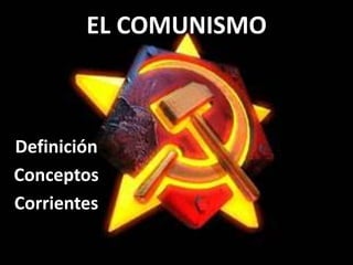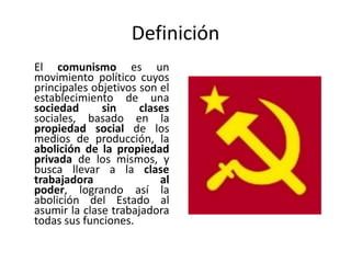 El comunismo busca establecer una sociedad sin clases sociales basada en la propiedad social y la abolición de la propiedad privada. Los regímenes comunistas se caracterizan por sistemas políticos totalitarios dominados por un único partido que controla todos los aspectos de la vida. Existen corrientes revisionistas que buscan alcanzar los objetivos comunistas de forma pacífica, y corrientes ortodoxas que apoyan la revolución y la violencia.