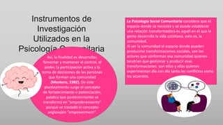 Este documento describe varios instrumentos de investigación utilizados en la psicología comunitaria, incluyendo encuestas, entrevistas, historias de vida, observación, cuestionarios, grupos focales y la evaluación de factores de riesgo y protección. La psicología comunitaria busca promover el desarrollo, empoderamiento y participación activa de las personas en la comunidad.