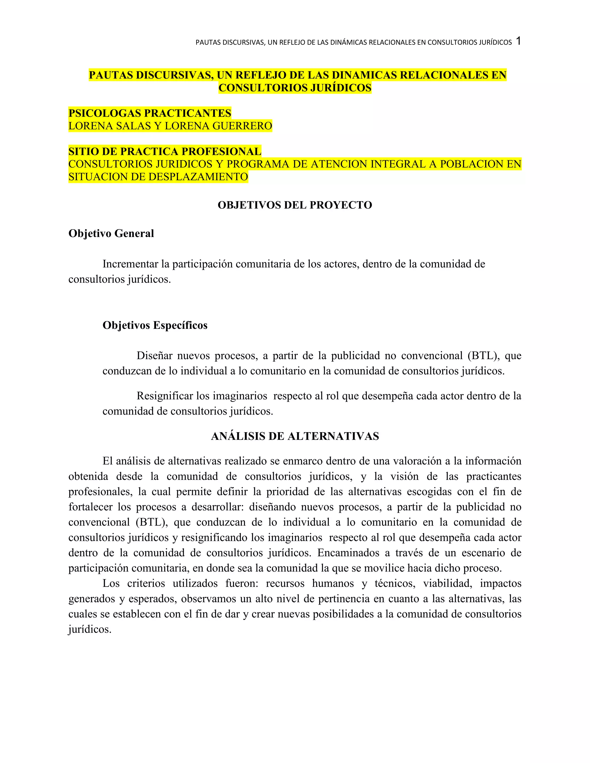 El documento presenta un proyecto de práctica profesional cuyo objetivo general es incrementar la participación comunitaria de los actores en consultorios jurídicos. Los objetivos específicos son diseñar nuevos procesos a partir de publicidad no convencional y resignificar los imaginarios sobre el rol de cada actor. El análisis de alternativas concluye que estas cumplen con los criterios de recursos, viabilidad e impacto. La matriz de planificación describe las actividades, indicadores, fuentes de verificación e hipótesis sobre lograr particip