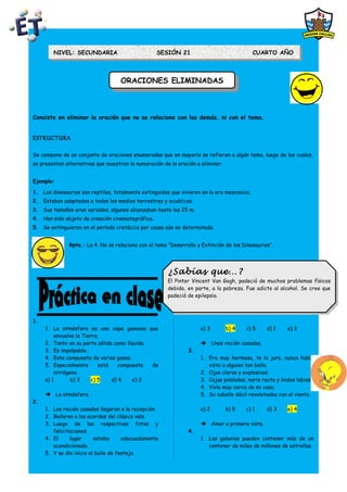 1. Este documento presenta un ejercicio de oraciones eliminadas que consiste en identificar la oración que no se relaciona con el tema del conjunto. 2. Se provee un ejemplo y luego un texto con oraciones enumeradas y alternativas de respuesta. 3. El objetivo es identificar la oración que no pertenece al tema general.
