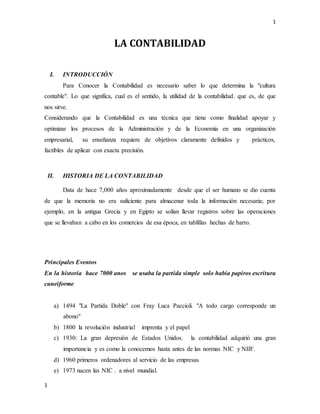 El documento proporciona una introducción a la contabilidad, incluyendo su historia, definición, objetivos, funciones, áreas, usuarios y principios. Explica que la contabilidad surgió hace aproximadamente 7,000 años y ha evolucionado a lo largo de la historia con hitos como el método de partida doble y el desarrollo de las Normas Internacionales de Información Financiera. Define la contabilidad como la ciencia de registrar información financiera de forma sistemática para apoyar la toma de decisiones en las organizaciones.