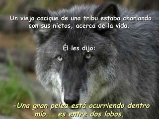 El viejo cacique le cuenta a sus nietos sobre la lucha interna entre dos lobos que representan las cualidades positivas y negativas en todos los seres humanos. El lobo de la bondad incluye cualidades como la paz, el amor y la compasión, mientras que el lobo de la maldad incluye la ira, el dolor y la envidia. Cuando los niños preguntan cuál lobo ganará, el cacique responde que ganará aquel que se alimente más.