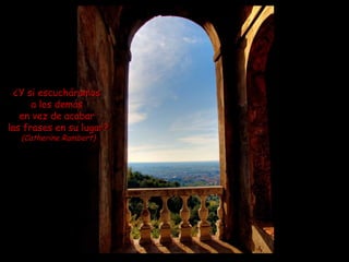 El documento presenta una serie de citas y reflexiones sobre temas como la escucha, la amistad, la aceptación de la vida y el discernimiento entre lo esencial y lo secundario. Algunas de las citas destacan la importancia de realizar buenas acciones sin esperar recompensa, de tener fuerza interior y paz mental, y de que la amistad es esencial para no sentirse solo en el mundo.