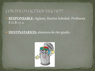 El documento propone un proyecto de reciclaje para estudiantes de 6to grado que utilizará la red social Facebook. El proyecto busca promover el reciclaje para reducir la basura, educar a los estudiantes sobre la importancia de separar y reciclar la basura, y desarrollar hábitos sustentables. Los estudiantes investigarán sobre los tipos de basura y el reciclaje, y compartirán lo aprendido a través de un grupo en Facebook.