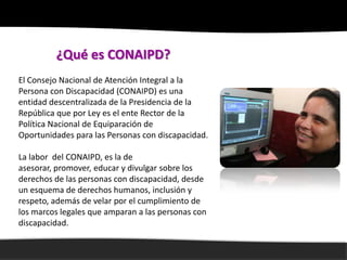 El Consejo Nacional de Atención Integral a la Persona con Discapacidad (CONAIPD) es la entidad responsable de la política nacional para la inclusión y equiparación de oportunidades de las personas con discapacidad. Su misión es promover y garantizar los derechos de estas personas, mientras que su visión busca un cambio social que asegure su inclusión plena en la sociedad. Además, se abordan temas como la clasificación de discapacidades, la importancia de cambiar mitos culturales y el marco legal que protege los derechos de las personas con discapacidad.