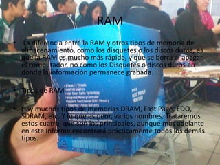 Este documento describe varios componentes fundamentales de una computadora, incluyendo la RAM, el disco duro, la placa base, los circuitos integrados y la memoria USB. Explica las diferencias entre la RAM y otros tipos de memoria, así como los tipos principales de RAM. También describe el funcionamiento y la importancia histórica del disco duro, así como los roles de la placa base y los circuitos integrados en una computadora.