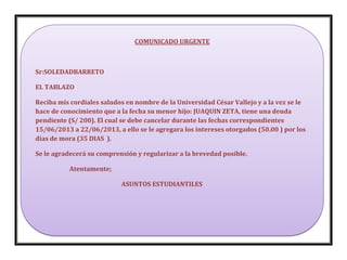 La Universidad César Vallejo informa a la Sra. Soledad Barreto que su hijo Juaquin Zeta tiene una deuda pendiente de S/ 200 con la universidad, la cual debe ser cancelada entre el 15 y 22 de junio de 2013 junto con S/ 50 de intereses por 35 días de mora. Se le pide regularizar la situación a la brevedad posible.