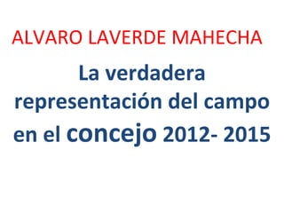 El documento presenta la candidatura de Alvaro Laverde Mahecha a concejal en representación del campo en el periodo 2012-2015. Propone fortalecer la economía a través de mejoras en enramadas y agroturismo, y ayudar a las familias a vender productos a cooperativas. También busca integrar las juntas de acción comunal mediante eventos para generar recursos e impulsar el mantenimiento de carreteables veredales.