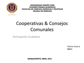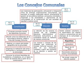 Este documento describe las cooperativas y consejos comunales en Venezuela. Explica que los consejos comunales permiten a las comunidades ejercer directamente la gestión de políticas públicas y proyectos para satisfacer sus necesidades. También describe los requisitos y procesos de elección, organización y revocatoria de los voceros de los consejos comunales según la Ley Orgánica de los Consejos Comunales de Venezuela.