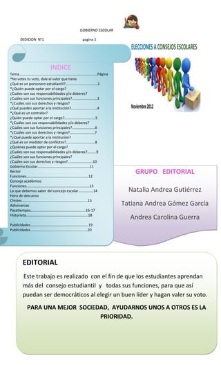 El documento proporciona información sobre los diferentes cargos de gobierno escolar como el personero estudiantil, el contralor y el mediador de conflictos. Explica quién puede optar por cada cargo, sus responsabilidades principales como representar a los estudiantes, vigilar el uso de recursos y resolver conflictos de manera pacífica, respectivamente. También describe los derechos y riesgos de estos cargos y cómo pueden contribuir a mejorar la comunicación y administración de la institución educativa.