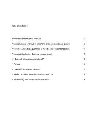 Este documento trata sobre la contaminación ambiental causada por el mal manejo de basuras y residuos sólidos en la ciudad de Santiago de Cali. Explica las causas de la contaminación, sus impactos ambientales como la contaminación del suelo, agua y aire, y los problemas de salud que genera. También describe el manejo integral de residuos sólidos que incluye etapas como la recolección, transporte, tratamiento y disposición final de manera sostenible.