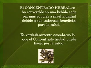 El documento describe 25 beneficios potenciales del concentrado herbal, incluyendo ayudar a reducir el riesgo de cáncer, enfermedades cardíacas y diabetes; mejorar la piel, los huesos y el colesterol; y apoyar la inmunidad, la memoria y la reducción del estrés. Se afirma que el concentrado herbal contiene antioxidantes que combaten el envejecimiento y promueven la longevidad.