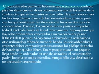 Un concentrador pasivo actúa como un conducto para los datos entre ordenadores conectados, compartiendo todo el ancho de banda internamente de forma que si un ordenador usa parte de la capacidad, el resto debe compartir lo que queda; además, cuando un paquete llega, el concentrador pasivo lo copia a todos los radios aunque vaya dirigido a uno solo.