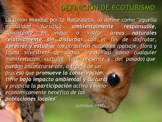 Este documento define el ecoturismo como una modalidad turística ambientalmente responsable que involucra viajar a áreas naturales relativamente sin disturbar con el fin de disfrutar y apreciar la naturaleza y cultura local mientras se promueve la conservación y participación de las comunidades locales. Explica que el ecoturismo supone el conocimiento, uso y conservación de la biodiversidad de manera sostenible a través de actividades diseñadas para facilitar el aprendizaje de los visitantes de forma coordinada por guías.