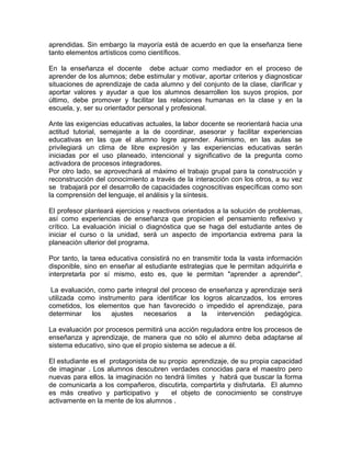 El documento describe las concepciones de enseñanza y aprendizaje desde una perspectiva constructivista. Explica que el aprendizaje es un proceso de construcción individual y activa del conocimiento basado en la experiencia, no una mera acumulación de información. La enseñanza debe crear entornos que faciliten este aprendizaje significativo. El aprendizaje significativo ocurre cuando los estudiantes relacionan nuevos conceptos con sus conocimientos previos y desarrollan un interés por el tema.