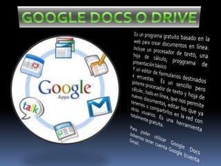 El documento describe varias herramientas digitales como blogger, webnode, pbworks, picasa y prezi que permiten compartir información, crear sitios web sin conocimiento técnico, colaborar en trabajos, organizar y compartir fotos, y crear presentaciones dinámicas. También describe a creative commons como una organización que promueve el uso compartido de contenido con licencias de copyright más flexibles.