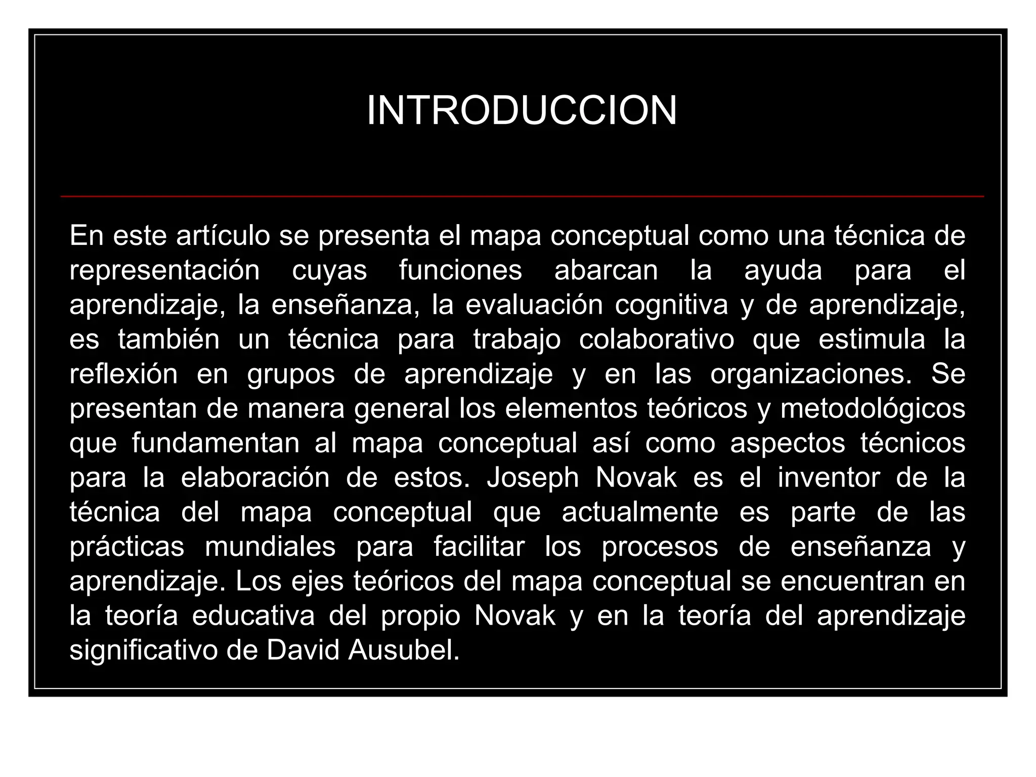 El documento presenta el mapa conceptual como una técnica para representar conocimientos que facilita procesos de enseñanza y aprendizaje. Joseph Novak desarrolló esta técnica basada en la teoría del aprendizaje significativo de Ausubel. Un mapa conceptual es una red jerárquica de conceptos unidos por líneas que representan sus relaciones, y puede elaborarse a partir de textos u otros materiales para organizar conocimientos sobre un tema.